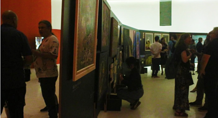 Os curadores conceberam uma expografia em que o suporte das obras, com 24 metros de linhas retas e pretas, contrasta com as curvas vermelhas e brancas do projeto arquitetônico do local. “A abordagem permitirá maior fruição entre obras e público”, acreditam os curadores Clauveci Murici e Gabriely Santos.